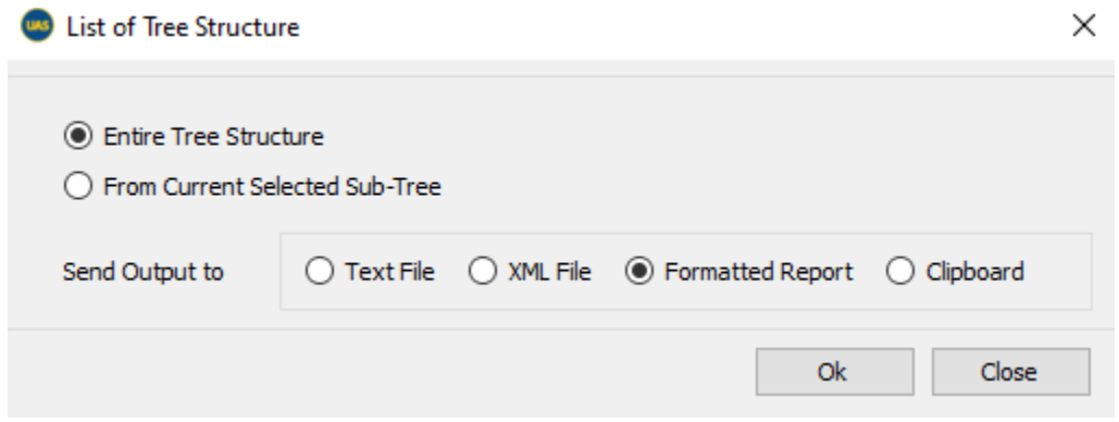 You may prefer to generate a Report of the Entire Tree structure or a Report starting from the Current Selected Sub-Tree, by ticking the appropriate button.