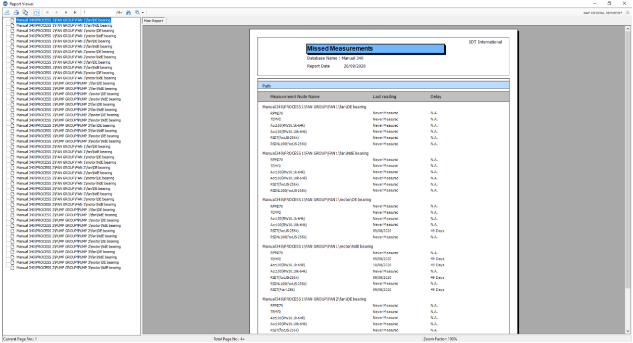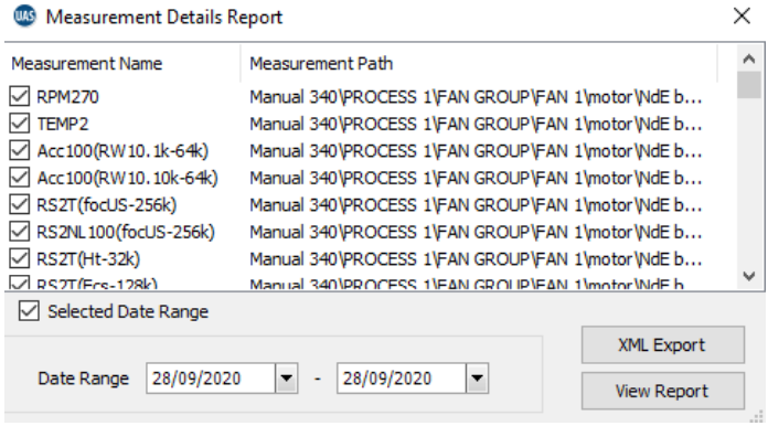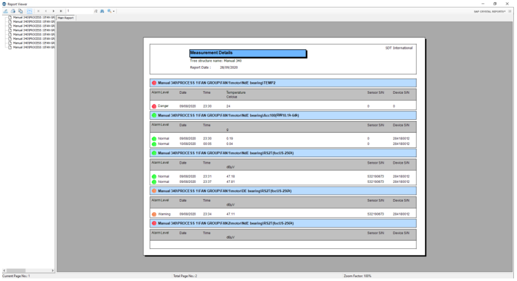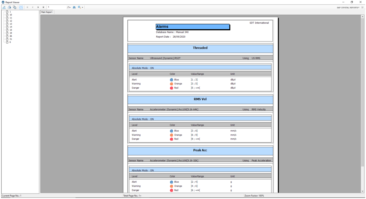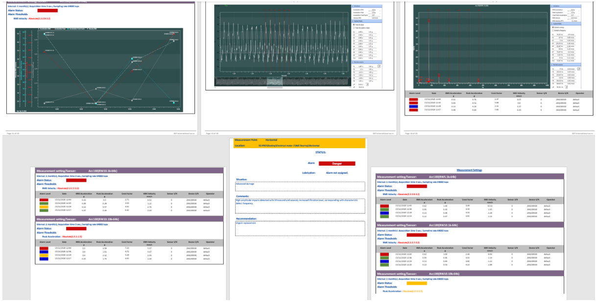 Apart from the selected graphs, the report will display all measurement data, alarms settings, alarm status, measurement settings like interval, acquisition time, sampling rate, software license number, sensor serial number, instrument serial number, operator name. All historical data will be displayed unless otherwise set in report settings (selected date range).