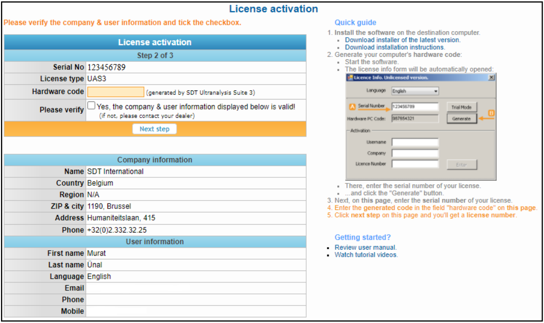 Visit our server at the address https://extranet.sdtultrasound.com/licenses/activate Encode your serial number in the corresponding field and then click Next step: